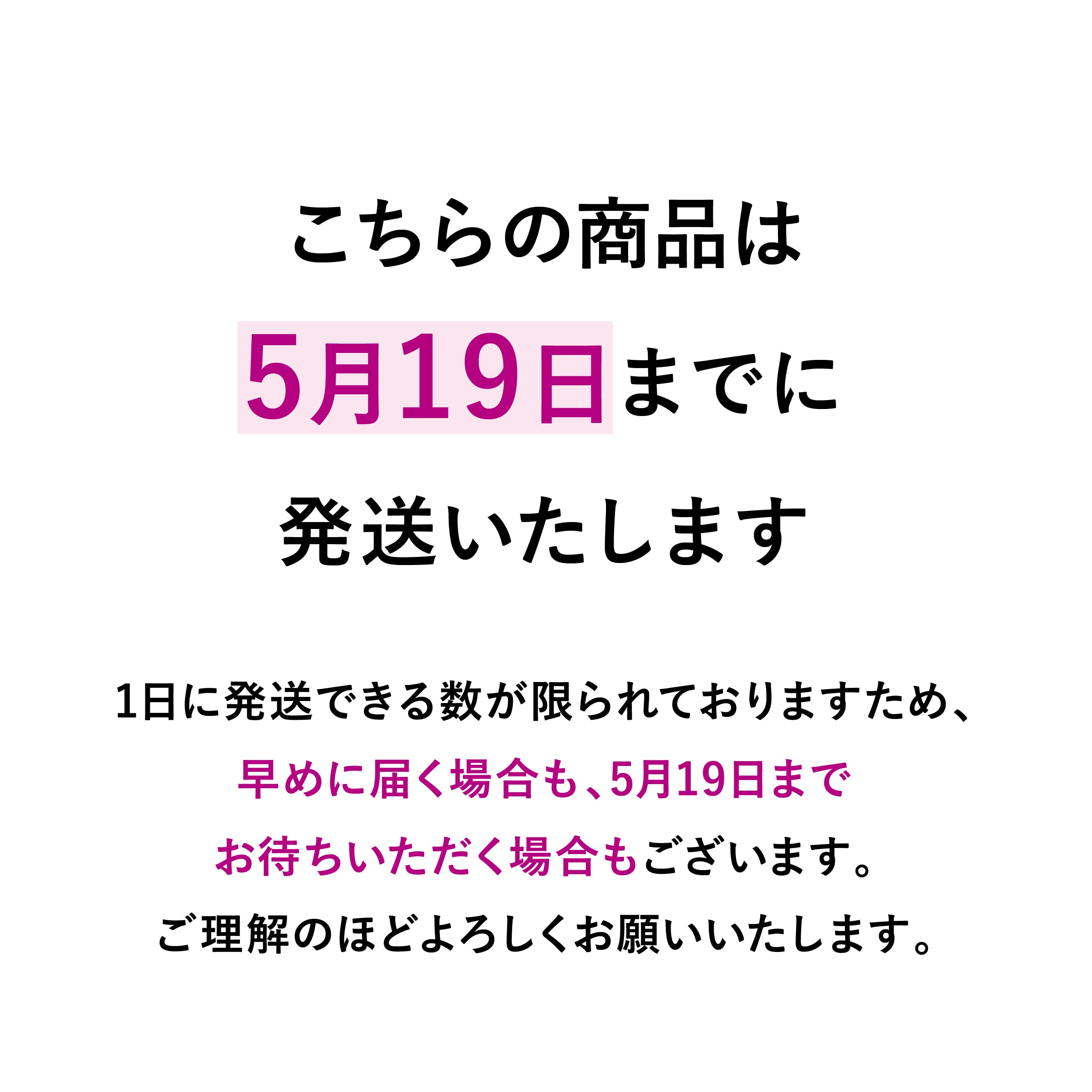 ※1日に発送できる数が限られておりますため、早くに届く場合も、5月19日までお待ちいただく場合もございます。また、いつごろ発送できますか、というご質問にはお答えできかねます。ご理解のほどよろしくお願いいたします。
